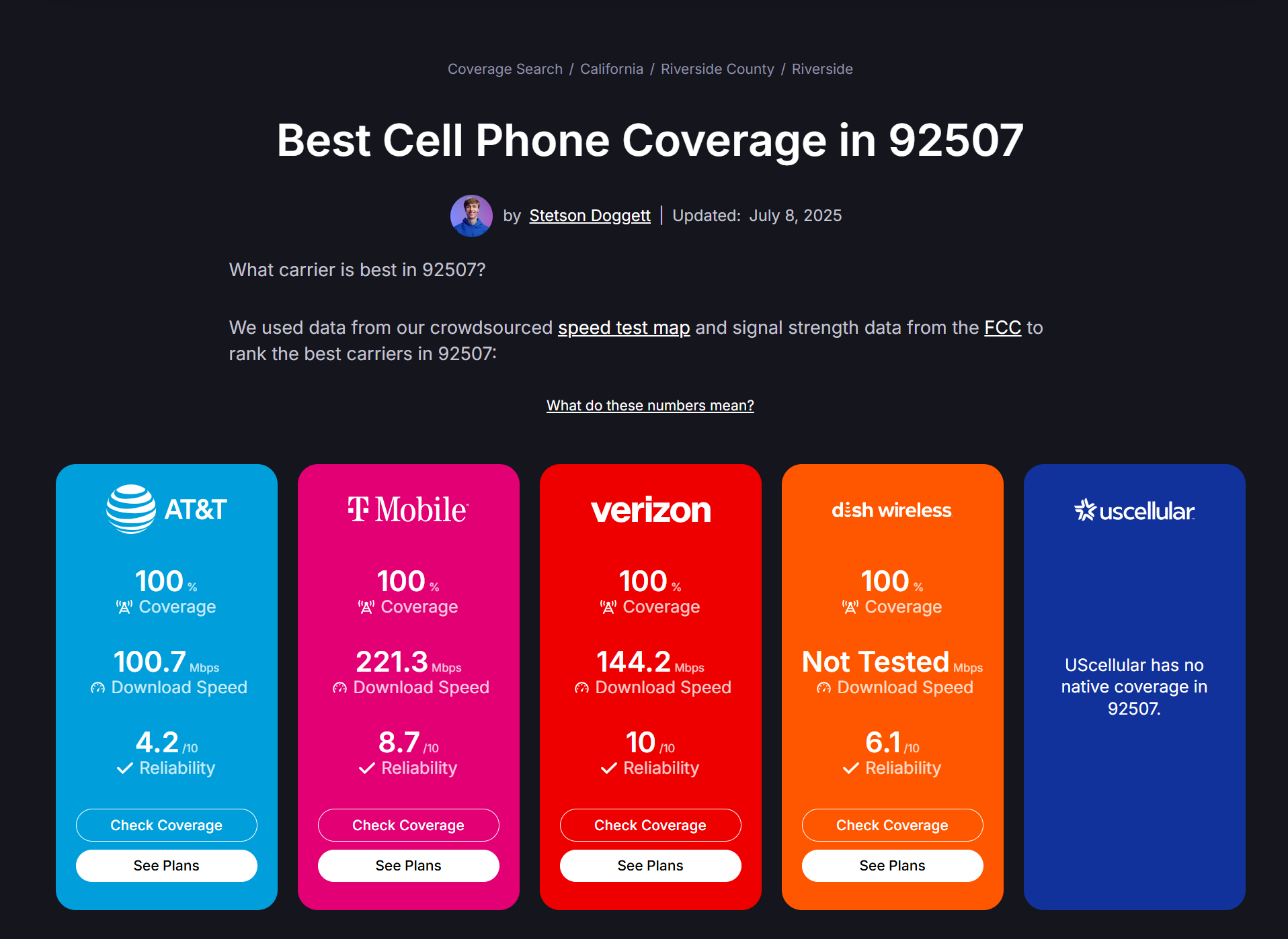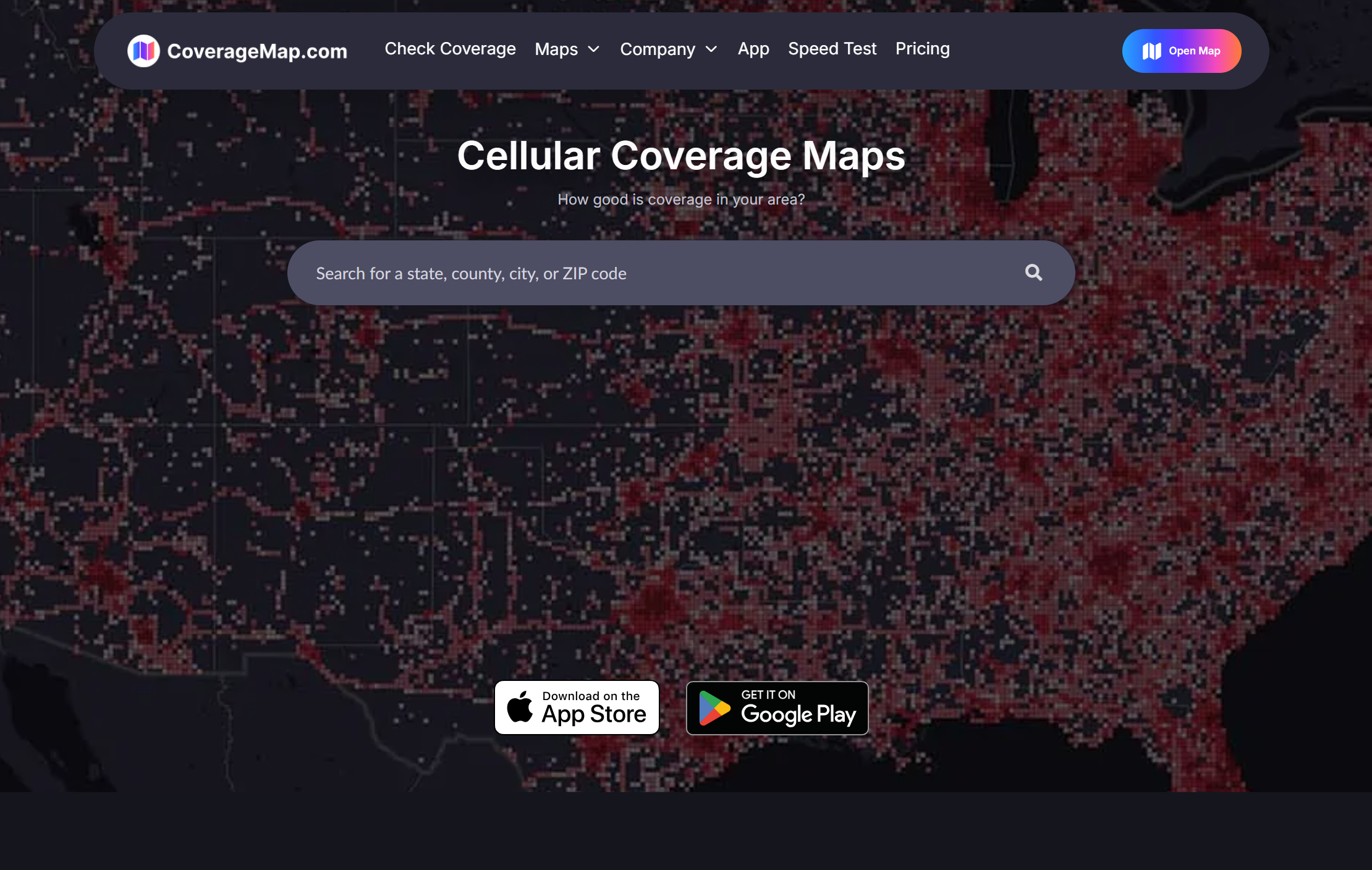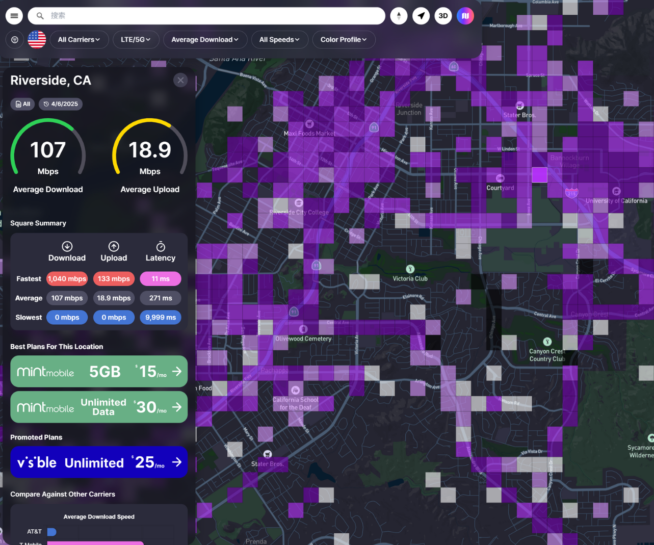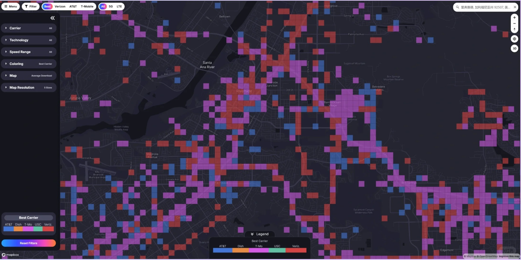 那么在正文中已经提到,各家运营商的官网对自己的覆盖区域非常自信,基本都会处于虚标的状态。所以一个真实的覆盖地图,且来自用户的真实使用反馈非常重要。本文使用CoverageMap作为案例给大家讲解。这个网站可以查看用户实际体验的覆盖范围、上网速度等信息,并且实时比较不同运营商在各个街区的表现,下面进入实操。