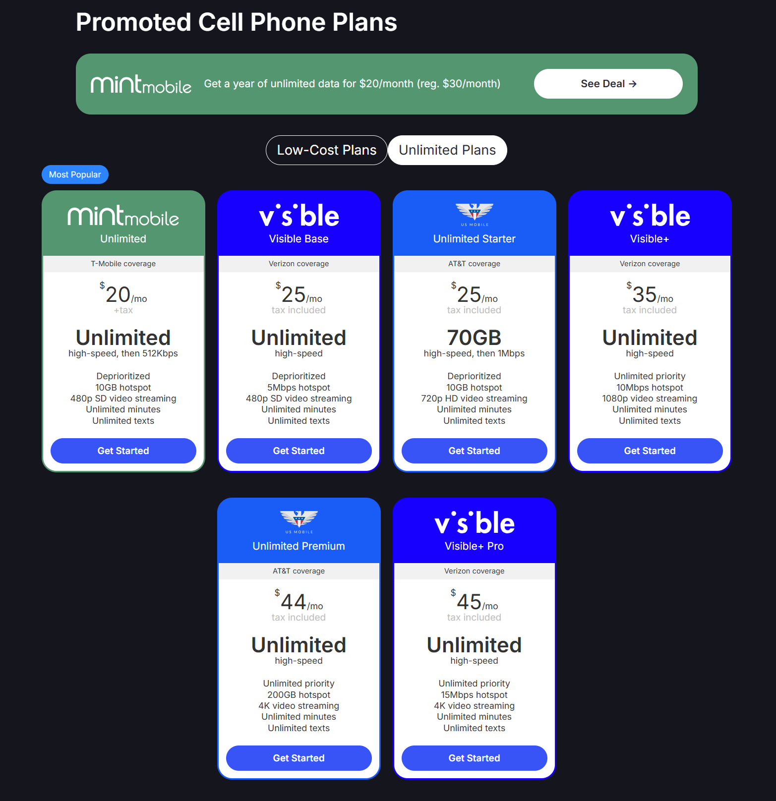 除此之外还有一个比较冷门的公司叫US Mobile。他家比较牛逼的是同时租用了三家主流运营商的设备,推出了三个虚拟套餐。不过根据楼主之前的使用体验,体验最好真的还得是Wrap(租用Verizon设备)。如果你不需要无限流量,可以考虑US Mobile的计划,且楼主认为此计划优先度高于Visible Basic。