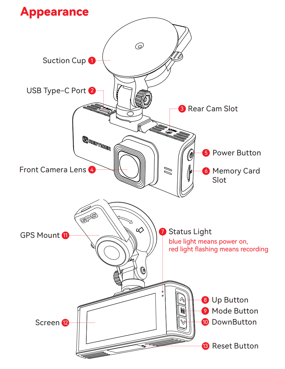 首先这是一个二通道的款式。根据说明书可知,在行车记录仪的上方一共有左右两个插口。(以屏幕正面为准)左边用于连接后摄像头(标号③),右边用于连接电源(标号②)。关于连接电源方面,自己安装连上点烟器即可;但如果专业的人帮你安装则可以接线到保险箱内。然后把前后摄像头分别贴在前后挡风玻璃上。